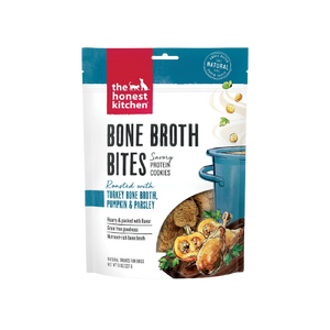 The Honest Kitchen believes that good dogs shouldn't settle for boring biscuits! That’s why our Bone Broth Bites combine savory turkey bone broth with nutrient-rich pumpkin, carrots and a touch of parsley into one healthy bite. Each delicious little cookie is slow baked in small batches and packed with protein so your pup can snack smarter.