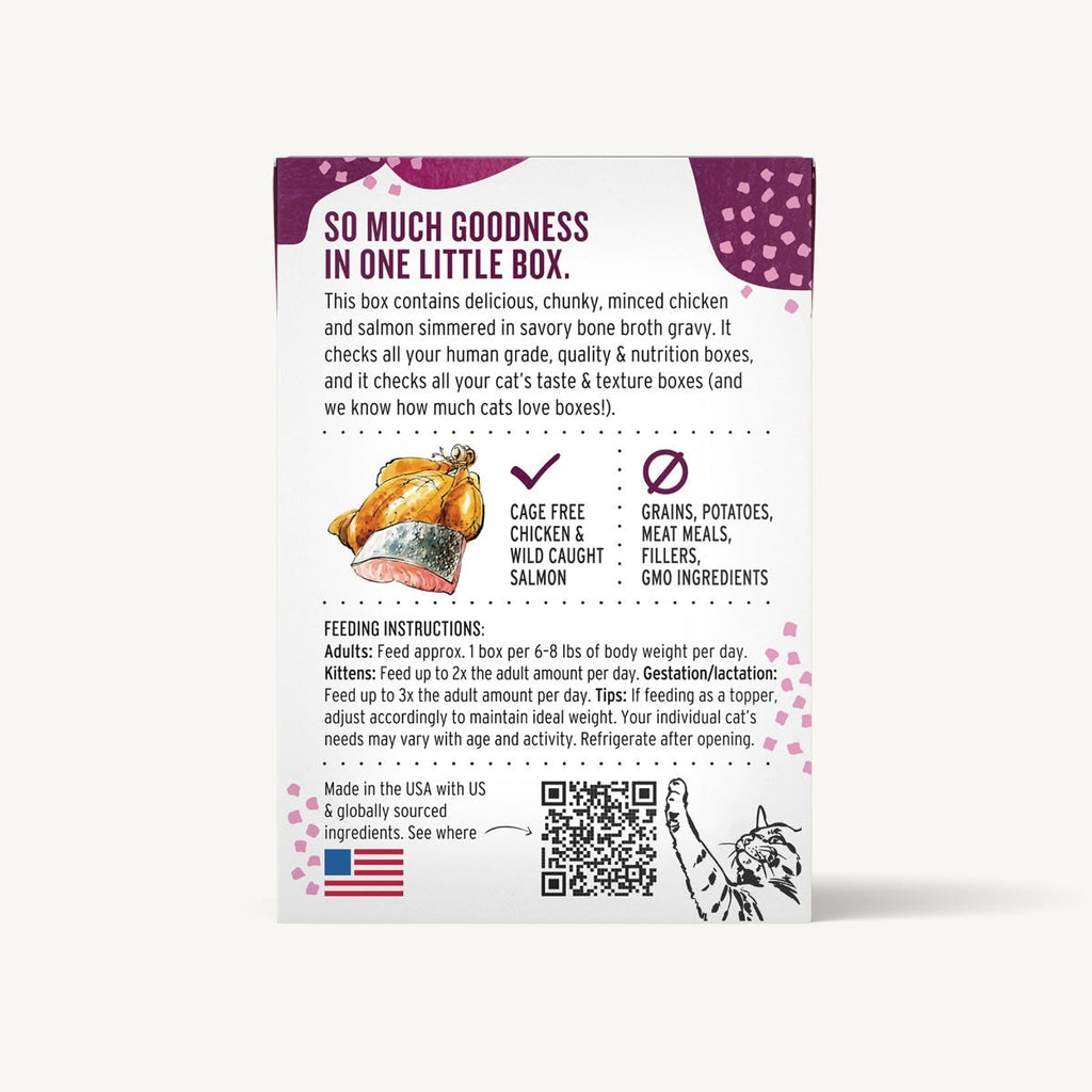 This boxes contains delicious, chunky, minced cage free chicken and wild caught salmon simmered in savory gravy. This 100% human grade recipe checks all your human grade, quality & nutrition boxes, and it checks all your cat’s taste & texture boxes (and we know how much cats love boxes!)