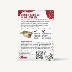 This boxes contains delicious, chunky, minced cage free chicken and wild caught salmon simmered in savory gravy. This 100% human grade recipe checks all your human grade, quality & nutrition boxes, and it checks all your cat’s taste & texture boxes (and we know how much cats love boxes!)