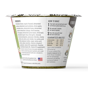 All ingredients dehydrated: Free-range chicken, organic flaxseed, potatoes, sweet potatoes, apples, celery, honey, pumpkin, cabe, bananas, papayas, green beans, organic kelp, garlic