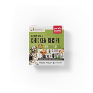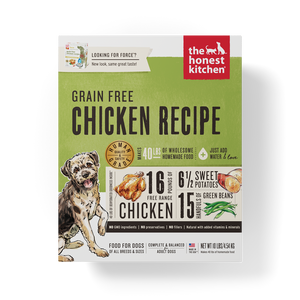 The Honest Kitchen Grain Free Chicken is designed for adult maintenance, senior dogs, or dogs who need a lower calorie diet. This formula contains free-range chicken, potatoes, celery and green beans. This formula is a grain and gluten free formula that is also free of eggs, beef, or fish.