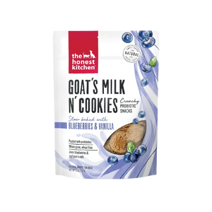 The Honest Kitchen believes that good dogs shouldn't settle for boring biscuits! With each bite of our Goat’s Milk N' Cookies, your pup gets a delicious dip of rich goat’s milk, juicy blueberries and a touch of sweet vanilla. Each little cookie is slow baked in small batches and full of probiotics to support a happy belly. Flavor meets function in every bite.