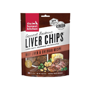 The Honest Kitchen believes that dogs deserve the absolute tastiest (but never-skimping-on-nutrition) human grade treats. That’s why we created our Gourmet Barbecue Liver Chips with the delicious, drool-worthy flavors that dogs love the most. These snacks deliver 89% ranch raised beef and a big burst of cheddar cheese, all slow baked and sliced into one protein-packed little chip.