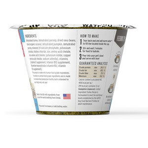 All ingredients dehydrated: Cage-free turkey, parsnips, navy bean, organic coconut, pumpkin, parsley