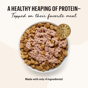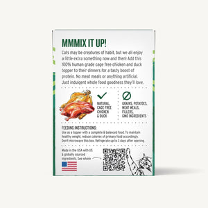 Mmmix it up! Cats may be creatures of habit, but we all enjoy a little extra something now and then! Add this 100% human grade, cage free chicken and duck topper to any meal or serve as a treat. No meat meals or anything artificial. Just a boost of indulgent protein they’ll love.