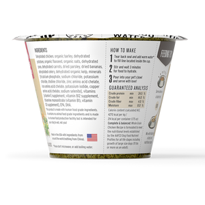 All ingredients dehydrated: Free-range chicken, organic barley, potatoes, organic flax, organic oats, green peas, carrots, parsley, bananas, celery, organic kelp