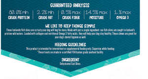 - This high protein dog chew is made with only dehydrated wild caught Icelandic cod and loaded with Omega-3s.