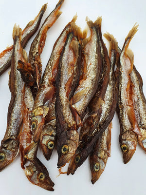Wild Seine-caught, 100% sustainable fish, loaded with Omega 3 fatty acids, your dogs won't stop loving these. These treats are 100% digestible fish, with nothing added. This high-protein dog chew is made with only dehydrated wild-caught capelin and loaded with Omega-3s.