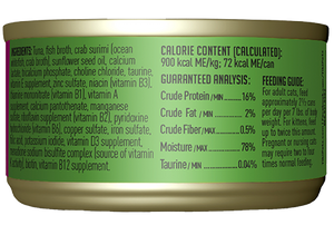 Tuna, fish broth, crab surimi (ocean whitefish, crab broth), sunflower seed oil, calcium lactate, tricalcium phosphate, choline chloride, taurine, vitamin E supplement, zinc sulfate, niacin (vitamin B3), thiamine mononitrate (vitamin B1), vitamin A supplement, calcium pantothenate, manganese sulfate, riboflavin supplement (vitamin B2), pyridoxine hydrochloride (vitamin B6), copper sulfate, iron sulfate, folic acid, potassium iodide, vitamin D3 supplement, menadione sodium bisulfite complex (source of vitamin K activity), biotin, vitamin B12 supplement.