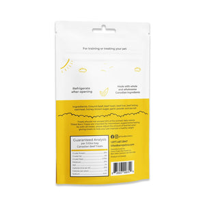 Our Canadian Beef Treats are healthy, soft meaty treats for dogs and cats of all ages and sizes. Our treats are preservative-free and contain no fillers or by-products. Our single-source protein treats are made with all-natural, high-quality, whole ingredients from the human food market sourced from across the Canadian Prairies, and are 100% Canadian-made. Our treats are available in 100g resealable packages.