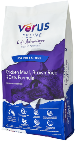 VēRUS Feline Life Advantage Chicken Meal, Brown Rice, & Oats Holistic Formula is a highly palatable dry cat food that is great for cats and kittens of all breeds, all life stages.