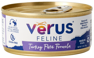 VeRUS Grain Free Turkey Pate Cat cans is an all natural, holistic pet food made with only the best, human-grade ingredients. This formula contains no by-products, fillers or chemical preservatives and is BPA free! This amazing grain free formula is appropriate for all life stages feeding.