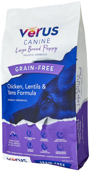 VēRUS Large Breed Puppy Chicken, Lentils & Yams Holistic Formula is a unique combination of fresh meats, vegetables and legumes. It is designed for dogs up to 20 months old and 70 pounds or more at maturity.