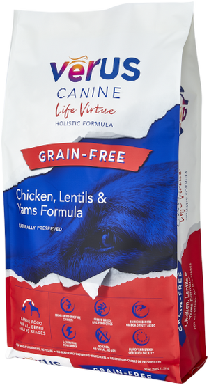 VēRUS Life Virtue Chicken, Lentils & Yams Holistic Formula is a combination of great-tasting, highly digestible, nutrient-packed fresh chicken, vegetables and legumes, providing complete and balanced nutrition for all breeds, all life stages.