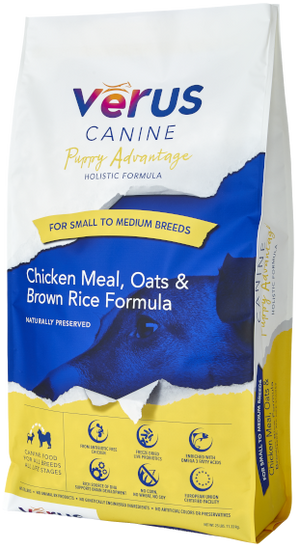 VēRUS Puppy Advantage Chicken Meal, Oats & Brown Rice Holistic Formula is designed for small and medium breed puppies whose weight is 70 lbs or less at maturity.