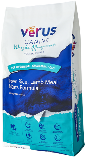VēRUS Weight Management Brown Rice, Lamb Meal & Oats Holistic Formula is designed for seniors and for healthy weight control.