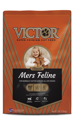 VICTOR Mers Classic Feline formula meets the standards for AAFCO nutritional profile essential to be “complete and balanced” as an All Life Stage formula for cats. This formula contains the nutrients essential to supporting a healthy pet, specifically: vitamins, minerals, essential fatty acids, and protein and amino acids.
