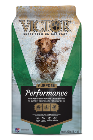 VICTOR Performance Dog Food is a grain inclusive formula for highly active dogs and growing puppies with high protein and fat and only 35% carbohydrates. This formula contains added glucosamine and chondroitin for joint support and contains NO corn, wheat, soy or gluten and NO GMO ingredients. High levels of Omega 3 and 6 support critical organ function. The multiple primary proteins in this food are Beef, Chicken and Pork.