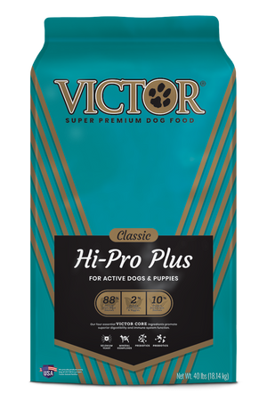 VICTOR Classic Hi-Pro Plus Dog Food is a grain inclusive formula for active dogs and puppies with high protein and fat and only 30% carbohydrates. This formula contains added vitamins and minerals for a healthy digestive system and contains NO corn, wheat, soy or gluten and NO GMO ingredients. The primary proteins in this food are Beef and Chicken.