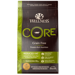 Wellness CORE Reduced Fat Dog Food is a grain-free, high protein formula that delivers a nutrient-rich, high-quality meat to a dog's diet. The CORE dog food contains more meat from only the highest quality, human-grade foods. Inside CORE is 80% more meat than the traditional dog food that contain the grains, while still controlling mineral and fat levels. Also you will find 5 different protein sources, USDA grade Deboned Turkey & Chicken and with High Quality (low Ash) Turkey & Chicken Meals and Chicken Liver.