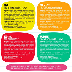 The B.F.F. Batch 'O Besties variety pack includes 3 each of Tuna and Chicken 4Eva, Tuna and Pumpkin Be Mine, Tuna and Salmon Soulmates and Tuna Too Cool!