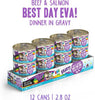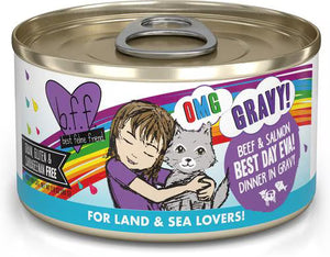 Turn meal time into yum time for your best feline friend with the BFF OMG Best Day Eva! Beef & Salmon Dinner in Gravy Grain-Free Canned Cat Food. Made with beef broth, beef and salmon as the top ingredients, plus essential vitamins and minerals, it provides a gravylicious and balanced diet for adult kitties. Since it’s packed with broth, it’s a great way to add much-needed hydration to keep your pal healthy. Plus, it’s made with sustainably sourced ingredients in state of the art food facilities with nothing artificial.
