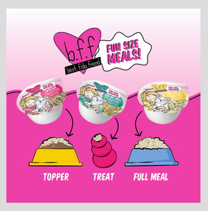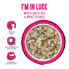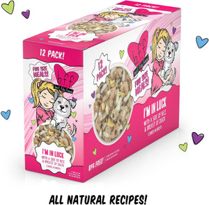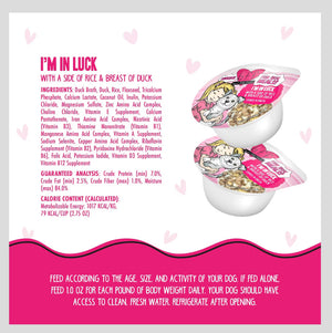 Give your barking bestie the nutrients he needs with Weruva Best Fido Friend Fun Size Meals I'm In Luck Wet Dog Food! This all-natural food features a savory gravy atop shredded duck and rice for a digestive boost. It’s free from gluten, carrageenan, corn, wheat, soy, preservatives, and artificial colors. Even the pickiest pup will lap up these tasty flavors, and you can rest easy knowing you’re giving him a fur-esh, high-quality meal!