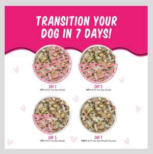 Despite how much your cat or dog asks for Weruva's high-quality foods, it's best to transition them gradually onto a new food over the course of one week. Start by mixing a small amount of Weruva in with their old food and slowly increase the proportion of Weruva over 7 days to help your pet adjust.