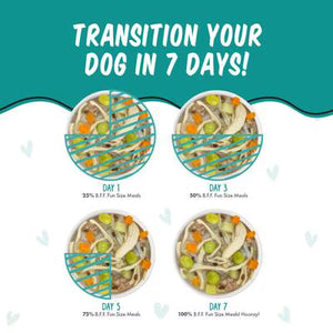 Despite how much your cat or dog asks for Weruva's high-quality foods, it's best to transition them gradually onto a new food over the course of one week. Start by mixing a small amount of Weruva in with their old food and slowly increase the proportion of Weruva over 7 days to help your pet adjust.