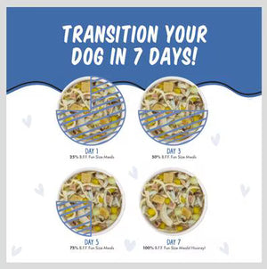 Despite how much your cat or dog asks for Weruva's high-quality foods, it's best to transition them gradually onto a new food over the course of one week. Start by mixing a small amount of Weruva in with their old food and slowly increase the proportion of Weruva over 7 days to help your pet adjust.