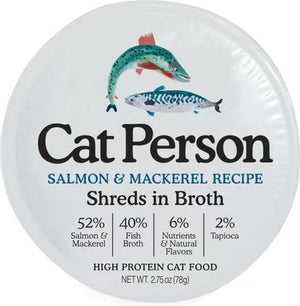 Enhance your bond with your kitty by serving them Cat Person Salmon & Mackerel Shreds in Broth Grain-Free Wet Cat Food. This natural, grain-free wet food is specially designed for feline physiques. It provides the majority of your furbaby’s daily water needs while also loading them up on protein to support a healthier and leaner cat. This yummy seafood recipe is grain-free and low in carbs, and it has no potatoes, corn, rice, or wheat. It’s a complete and balanced meal for all life stages, from kitten to grandcat. Plus, you’re going to love the Serve & Store Set, which is easy to open and can be used to store partial servings.