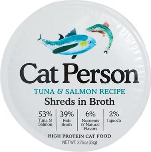 Enhance the unique bond between you and your kitty with Cat Person Tuna & Salmon Shreds in Broth Grain-Free Wet Cat Food. This natural, grain-free wet food provides your furbaby with the majority of their daily water intake. And, with 95% more protein than the industry standard, this recipe food supports a healthier and leaner physique for your beloved buddy. You’ll also be happy to know that this formula uses sustainably sourced seafood for a guilt-free meal. Even better, this wet food is grain-free and low-carb, with no potatoes, corn, rice, or wheat. It is suitable for all life stages, from kittens to grandcats, and can be easily served and stored with the convenient Serve & Store Set.