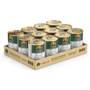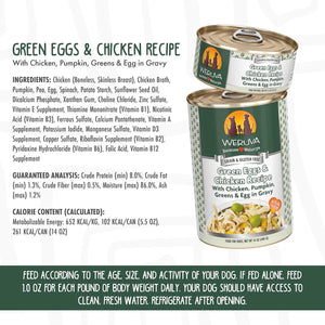 Weruva Green Eggs and Chicken Dog Cans are made with real, boneless, skinless, white chicken breasts loaded with the best green veggies in a tasty gravy! This formula is packed full of green peas and spinach! The chicken used in all Weruva's formulas are free of added antibiotics and hormones and are also free range. This formula is grain free and appropriate for adult dogs!