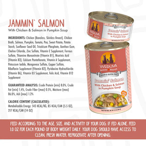 Weruva Jammin Salmon Dog Cans are made with real, boneless, skinless, white chicken breast and wild caught salmon. This formula is loaded with Omega-3s for healthy skin and coat. There are added tomatoes, green peas and sweet potatoes to make one delicious meal! The chicken used in all Weruva's formulas are free of added antibiotics and hormones and are also free range. This formula is grain free and appropriate for adult dogs!