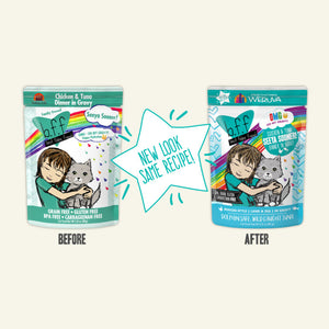 Your kitty will say, “Seeya!” and dash to this delicious meal in their food bowl. The tasty, minced chicken and tuna in gravy will leave your best feline friend without a care in the world as they lap up all of the flavor packed into this pouch!