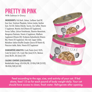 Pretty In Pink consists of wild caught pink salmon in gravy. This recipe is loaded with Omega-3 for a beautifully healthy skin and coat. This formula is Grain Free!