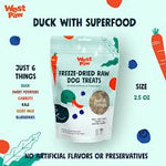 Farm-fresh fruits and veggies from the Pacific Northwest blended with duck and freeze-dried to preserve nutrition. We added probiotic pumpkin to these nutrition packed treats! These superfood bombs combine protein-packed duck, fiber-rich pumpkin, beta-carotene-loaded sweet potatoes, superfood blueberries, spinach, and kale, probiotic goat milk—and nothing else. And then they’re freeze-dried so not a single sliver of nutrition is lost. Perfect for chicken-sensitive dogs, made from cage-free duck that is humanely raised without hormones or antibiotics.