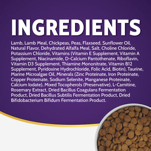Lamb, Lamb Meal, Peas, Chickpeas, Pea Flour, Sunflower Oil (preserved with Citric Acid), Pea Protein, Flaxseed, Natural Flavors, Dehydrated Alfalfa Meal, Dried Beet Pulp, Potassium Chloride, Salt, Minerals (Zinc Proteinate, Iron Proteinate, Copper Proteinate, Manganese Proteinate, Cobalt Proteinate, Selenium Yeast), Choline Chloride, Taurine, Vitamins (Vitamin A Acetate, Vitamin D3 Supplement, Vitamin E Supplement, Niacin, d-Calcium Pantothenate, Thiamine Mononitrate, Pyridoxine Hydrochloride, Riboflavin Supplement, Folic Acid, Biotin, Vitamin B12 Supplement), Blueberries, Carrots, Cranberries, Lactic Acid, DL Methionine, Calcium Iodate, Preserved with Mixed Tocopherols.