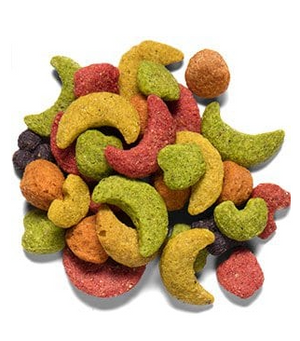 Ground corn, Soybean meal, Ground wheat, Vegetable oil (preserved with mixed tocopherols), Wheat germ meal, Sugar, Calcium carbonate, Dicalcium phosphate, Oranges, Apples, DL-Methionine, Iodized salt, Natural fruit flavors, Grapes, Bananas, Choline chloride, Vitamins (Vitamin E supplement, Niacin supplement, Biotin, d-Calcium pantothenate, Riboflavin supplement, Pyridoxine hydrochloride, Thiamine mononitrate, Vitamin A acetate, Vitamin D3 supplement, Menadione sodium bisulfite complex (source of Vitamin K activity), Vitamin B12 supplement, Folic acid), L-lysine monohydrochloride, Citric acid (preservative), Mixed tocopherols (preservative), Yellow 5, L-ascorbyl-2-polyphosphate (a source of Vitamin C), Red 40, Yellow 6, Minerals (Manganous oxide, Zinc oxide, Copper sulfate, Sodium selenite, Calcium iodate), Color added, Blue 1, Red 3, Rosemary extractGuaranteed Analysis