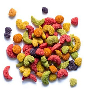 Ground corn, Soybean meal, Ground wheat, Vegetable oil (preserved with mixed tocopherols), Wheat germ meal, Sugar, Calcium carbonate, Dicalcium phosphate, Oranges, Apples, DL-Methionine, Iodized salt, Natural fruit flavors, Grapes, Bananas, Choline chloride, Vitamins (Vitamin E supplement, Niacin supplement, Biotin, d-Calcium pantothenate, Riboflavin supplement, Pyridoxine hydrochloride, Thiamine mononitrate, Vitamin A acetate, Vitamin D3 supplement, Menadione sodium bisulfite complex (source of Vitamin K activity), Vitamin B12 supplement, Folic acid), L-lysine monohydrochloride, Citric acid (preservative), Mixed tocopherols (preservative), Yellow 5, L-ascorbyl-2-polyphosphate (a source of Vitamin C), Red 40, Yellow 6, Minerals (Manganous oxide, Zinc oxide, Copper sulfate, Sodium selenite, Calcium iodate), Color added, Blue 1, Red 3, Rosemary extractGuaranteed Analysis