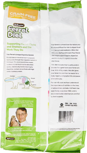 Fuel your ferret’s high-energy lifestyle with ZuPreem Grain Free Ferret Diet Daily Food for Ferrets! This complete diet is formulated to be your adult ferret’s primary daily food. The grain-free recipe features real chicken, natural flavors plus essential vitamins and minerals your ferret needs to thrive. Perfect for picky eaters, ZuPreem Grain Free Ferret Diet includes 40% protein and 20% fat to help keep your ferret happy and healthy.