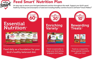 Feed based on recommended daily amounts indicated below. Adjust amounts to ensure your bird’s optimum body condition. Feed daily to provide the foundation of your bird’s diet. Keep fresh food and water available at all times. Discard uneaten food before each feeding. As with all foods, wash hands after use and food and water bowls before each feeding.