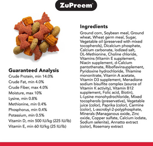 - Tasty, pasta-colored food can be mixed with other ZuPreem pelleted foods (sold separately) to add more variety without sacrificing nutrition.