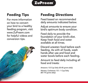 Feed based on recommended daily amounts indicated below. Adjust amounts to ensure your bird’s optimum body condition. Feed daily to provide the foundation of your bird’s diet. Keep fresh food and water available at all times. Discard uneaten food before each feeding. As with all foods, wash hands after use and food and water bowls before each feeding.