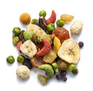 Ground corn, Dried bananas, Pistachios, Carrots, Dried peas, Dried pineapple, Peanuts, Soybean meal, Dried chili peppers, Ground wheat, Sesame seeds, Sugar, Wheat germ meal, Vegetable oil (preserved with mixed tocopherols), Rice flour, Calcium carbonate, Dicalcium phosphate, Rice starch, Salt, Natural flavors, Wheat flour, DL-Methionine, Dried oranges, Dried apples, Dried grapes, Choline chloride, L-Lysine monohydrochloride, Vitamins (Vitamin E supplement, Niacin supplement, Biotin, d-Calcium pantothenate, Riboflavin supplement, Pyridoxine hydrochloride, Thiamine mononitrate, Vitamin A acetate, Vitamin D3 supplement, Menadione sodium bisulfite complex (source of Vitamin K activity), Vitamin B12 supplement, Folic acid), Citric acid (preservative), Mixed tocopherols (preservative), Yellow 5, L-ascorbyl-2-polyphosphate, Red 40, Yellow 6, Minerals (Manganous oxide, Zinc oxide, Copper sulfate, Sodium selenite, Calcium iodate), Ammonium bicarbonate, Sodium bicarbonate, Sulfur dioxide (preservative), Sodium metabisulphite (preservative), Color added, Blue 1, Red 3