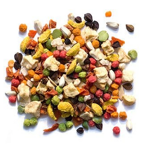 Whole buckwheat, Ground corn, Dried carrots, Dried lentils, Dried peas, Safflower seeds, Dried pineapple, Cucumber seeds, Diced apples, Soybean meal, Ground wheat, Sugar, Wheat germ meal, Vegetable oil (preserved with mixed tocopherols), Calcium carbonate, Dicalcium phosphate, Iodized salt, Natural flavors, DL-Methionine, Dried oranges, Dried grapes, Dried bananas, Choline chloride, L-Lysine monohydrochloride, Vitamins (Vitamin E supplement, Niacin supplement, Biotin, d-Calcium pantothenate, Riboflavin supplement, Pyridoxine hydrochloride, Thiamine mononitrate, Vitamin A acetate, Vitamin D3 supplement, Menadione sodium bisulfite complex (source of Vitamin K activity), Vitamin B12 supplement, Folic acid), Citric acid (preservative), Mixed tocopherols (preservative), Yellow 5, L-ascorbyl-2-polyphosphate, Red 40, Yellow 6, Minerals (Manganous oxide, Zinc oxide, Copper sulfate, Sodium selenite, Calcium iodate), Sulfur dioxide (preservative), Color added, Blue 1