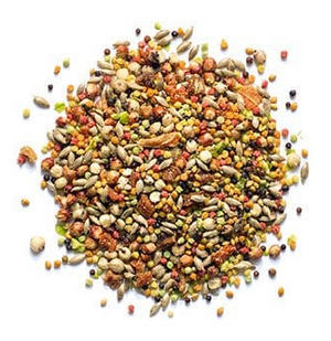 Canary grass seeds, Millet, Red milo, White milo, Canola, Ground corn, Dried carrots, Dried peas, Dried bananas, Soybean meal, Ground wheat, Sugar, Wheat germ meal, Vegetable oil (preserved with mixed tocopherols), Calcium carbonate, Dicalcium phosphate, Salt, Natural flavors, DL-Methionine, Dried oranges, Dried apples, Dried grapes, Choline chloride, L-Lysine monohydrochloride, Vitamins (Vitamin E supplement, Niacin supplement, Biotin, d-Calcium pantothenate, Riboflavin supplement, Pyridoxine hydrochloride, Thiamine mononitrate, Vitamin A acetate, Vitamin D3 supplement, Menadione sodium bisulfite complex (source of Vitamin K activity), Vitamin B12 supplement, Folic acid), Citric acid (preservative), Mixed tocopherols (preservative), Yellow 5, L-ascorbyl-2-polyphosphate, Red 40, Yellow 6, Minerals (Manganous oxide, Zinc oxide, Copper sulfate, Sodium selenite, Calcium iodate), Color added, Blue 1