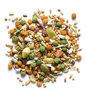 Proso millet, Canary grass seeds, Oat groats, Ground corn, Safflower seeds, Soybean meal, Shelled squash seeds, Dried coconut, Dried papaya, Dried pineapple, Dried cranberries, Sugar, Corn gluten meal, Flaxseeds, Calcium carbonate, Dried cane molasses, Dried beet molasses, Dicalcium phosphate, Ground wheat, Salt, Fructooligosaccharide, L-Lysine monohydrochloride, Wheat germ meal, Vegetable oil (preserved with mixed tocopherols), Choline chloride, DL-Methionine, Vitamins (Vitamin E supplement, Niacin supplement, Biotin, d-Calcium pantothenate, Riboflavin supplement, Pyridoxine hydrochloride, Thiamine mononitrate, Vitamin A acetate, Vitamin D3 supplement, Menadione sodium bisulfite complex (source of Vitamin K activity), Vitamin B12 supplement, Folic acid), Potassium chloride, Minerals (Manganous oxide, Zinc oxide, Copper sulfate, Sodium selenite, Calcium iodate), L-ascorbyl-2-polyphosphate, Natural flavors, Citric acid (preservative), Mixed tocopherols (preservative), Dried oranges, Dried apples, Dried grapes, Dried bananas, Yellow 6, Yellow 5, Blue 1, Red 40, Color added, Sulfur dioxide (preservative), Dried Bacillus licheniformis fermentation product, Dried Bacillus subtilis fermentation product.